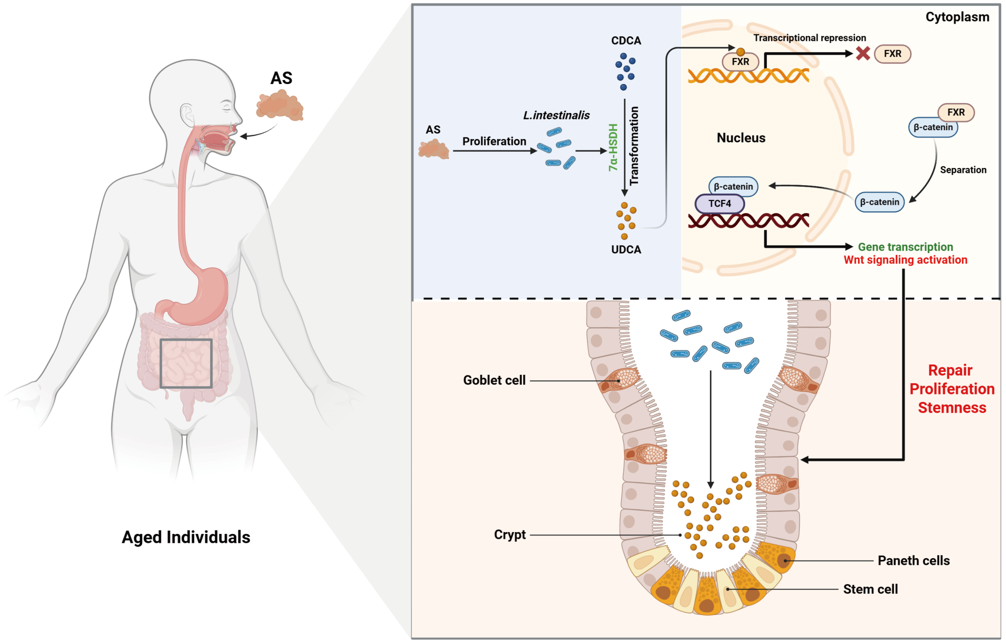 研究发现AS主要通过调控肠道微生物发挥作用。AS能够调节自然衰老小鼠的肠道微生物组成,并促进Lactobacillus intestinalis的增殖,从而增强肠道干性。进一步研究发现,由Lactobacillus intestinalis调控胆汁酸代谢产生的熊去氧胆酸(Ursodeoxycholic acid, UDCA)是AS影响肠道干性的关键介质。UDCA能够抑制肠上皮细胞中的FXR信号,FXR抑制增强了β-catenin与TCF4的结合,从而激活Wnt信号通路及其靶基因的转录。这一系列变化增强了肠道干细胞的修复、增殖和干性,促进了肠道上皮的稳态和再生。
